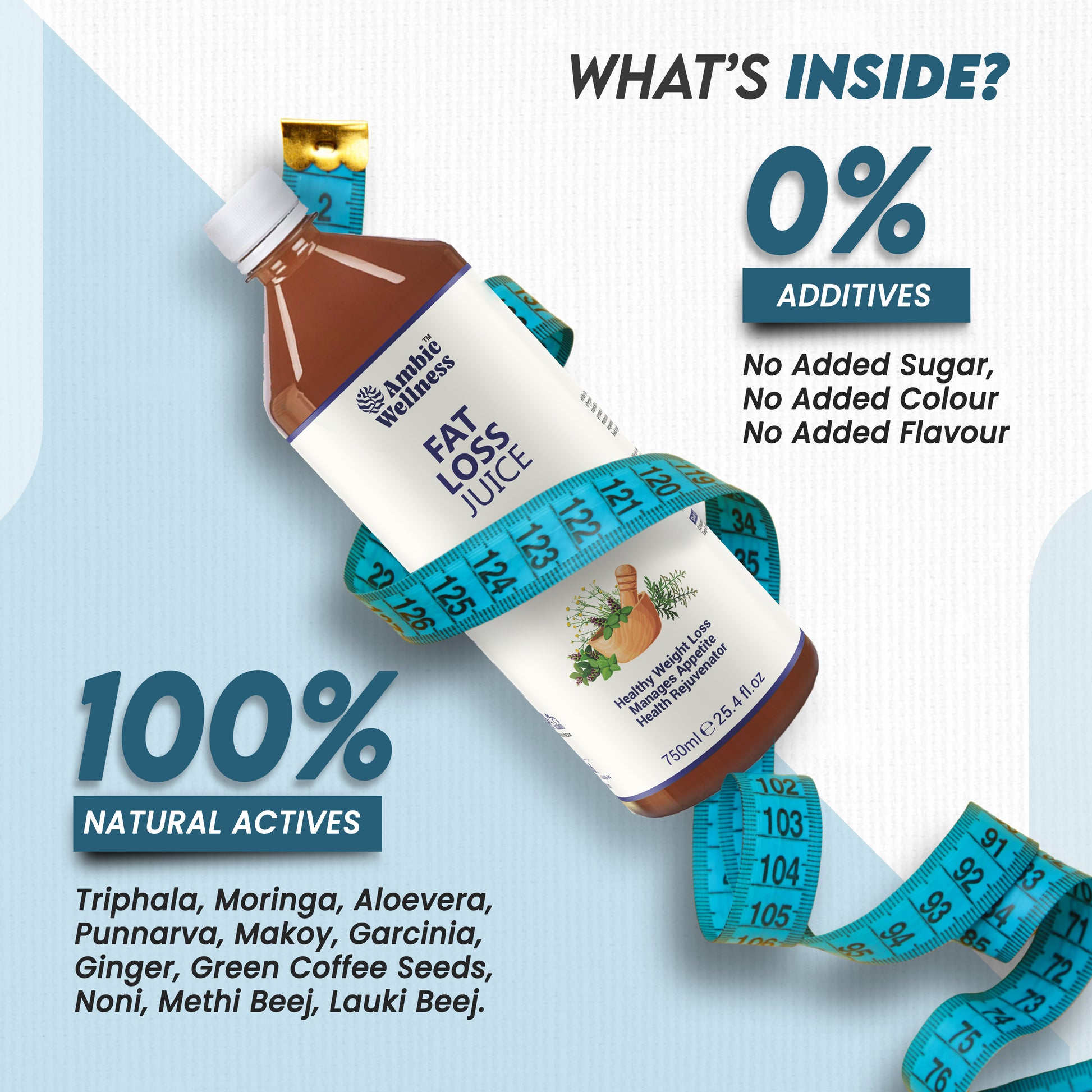 Ambic Fat Loss Juice is an Ayurvedic blend formulated to support fat metabolism, appetite control, and digestion. It contains Green Coffee Seeds, Garcinia, Pumpkin Seeds, and Triphala, which help in effective fat reduction.