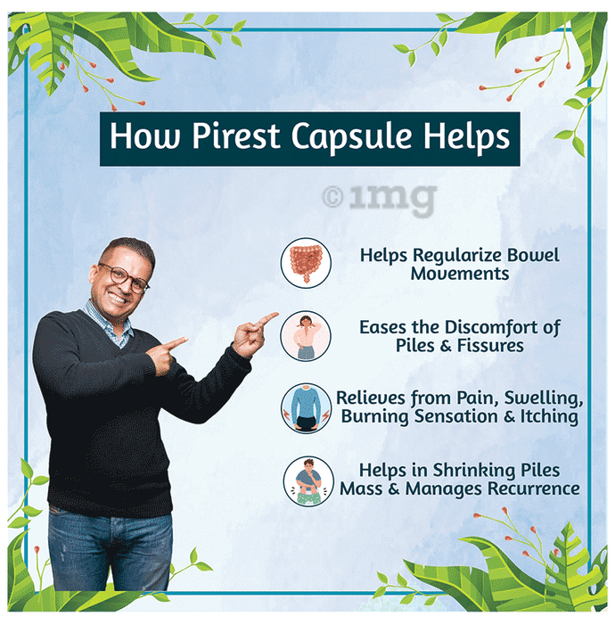 - Manages piles: Pirest Piles Care Capsule can significantly reduce the discomfort and irritation associated with piles. It keeps your body hydrated and supplies essential minerals and vitamins, reducing the risk of piles caused by bowel movements straining your body