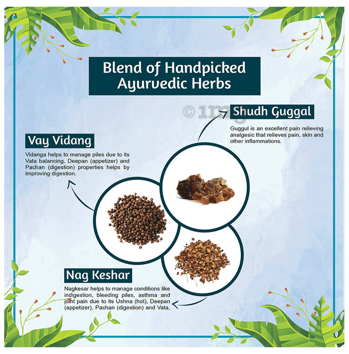 - Ayurvedic herbs: The Piles Care capsule contains pure natural herbs that are natural and effective formulations. It consists of herbs like bay vidang, harad, soanth, sudh guggal, and jeerak