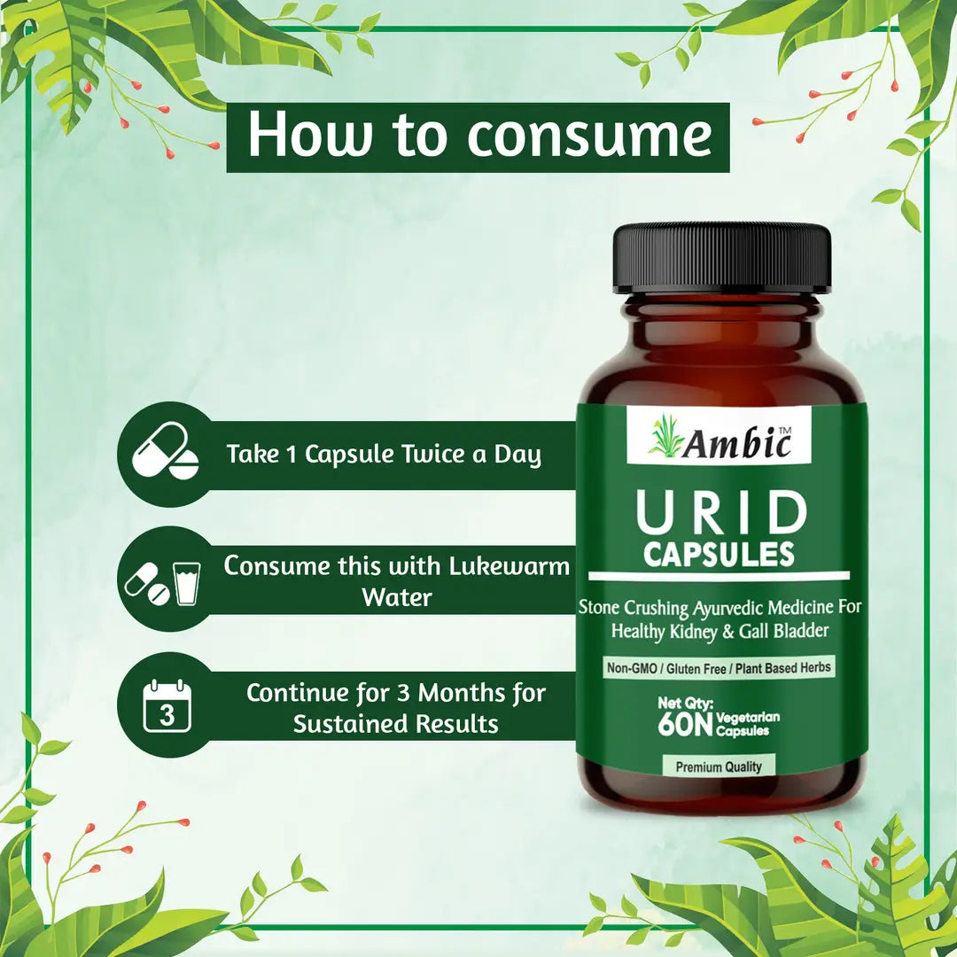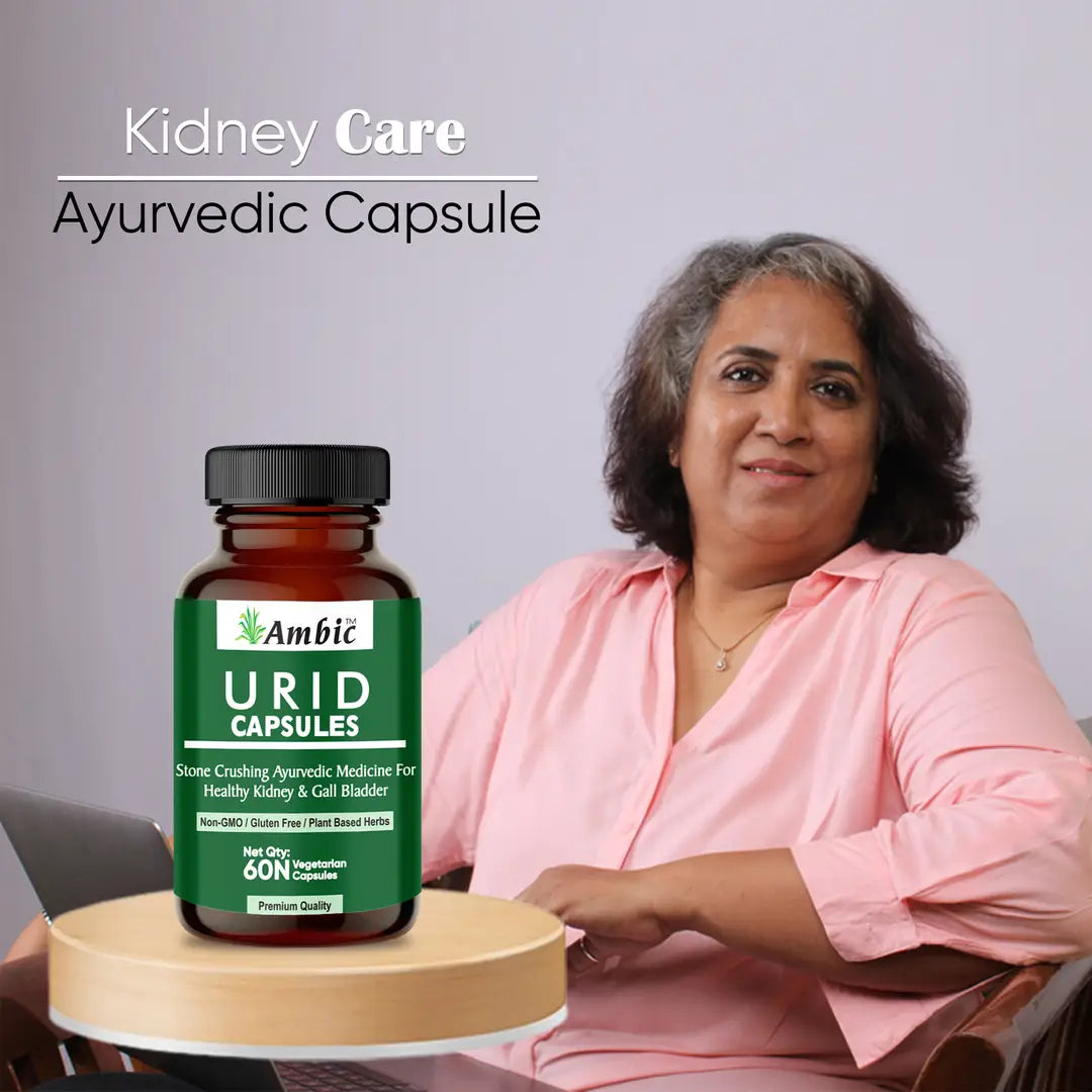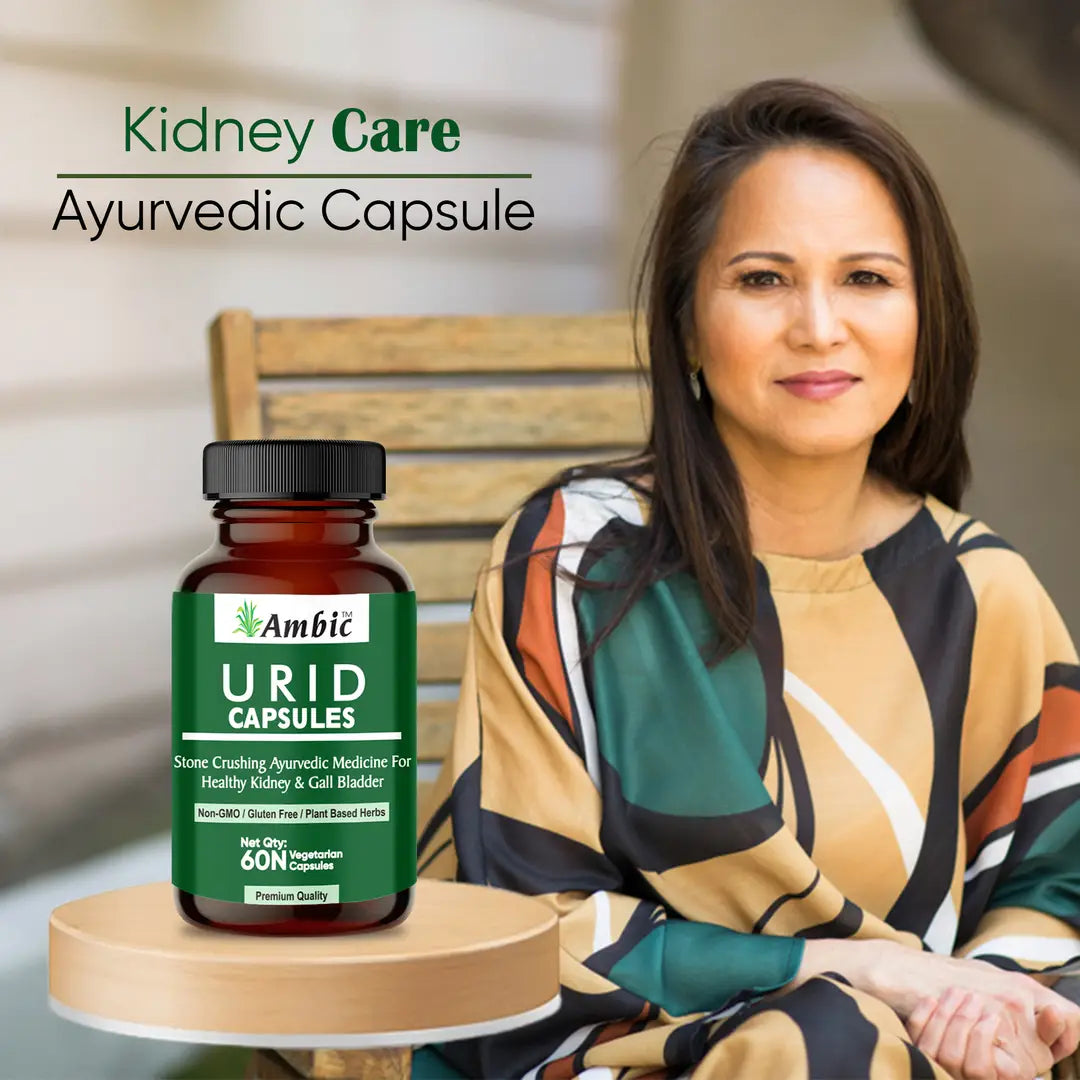 Ambic Urid Vegetarian Capsule is a potent Ayurvedic formulation designed to support kidney wellness, dissolve kidney lumps, and combat urinary tract infections. Its powerful blend of herbs, including gokshura, anant mool, daru haldi, and punarnava, aids in kidney detox and rejuvenation. This kidney support supplement offers a natural way to assist kidney functions gradually, addressing issues before they progress. By effectively flushing out toxins, it acts on the root cause of kidney concerns, ensuring a holistic approach to kidney health.